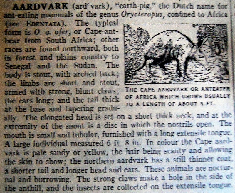 “I woke up the next morning, thinking about those words — immensely proud to realize that not only had I written so much at one time, but I’d written words that I never knew were in the world. Moreover, with a little effort, I also could remember what many of these words meant. I reviewed the words whose meanings I didn’t remember. Funny thing, from the dictionary first page right now, that “aardvark” springs to my mind. The dictionary had a picture of it, a long-tailed, long-eared, burrowing African mammal, which lives off termites caught by sticking out its tongue as an anteater does for ants.
